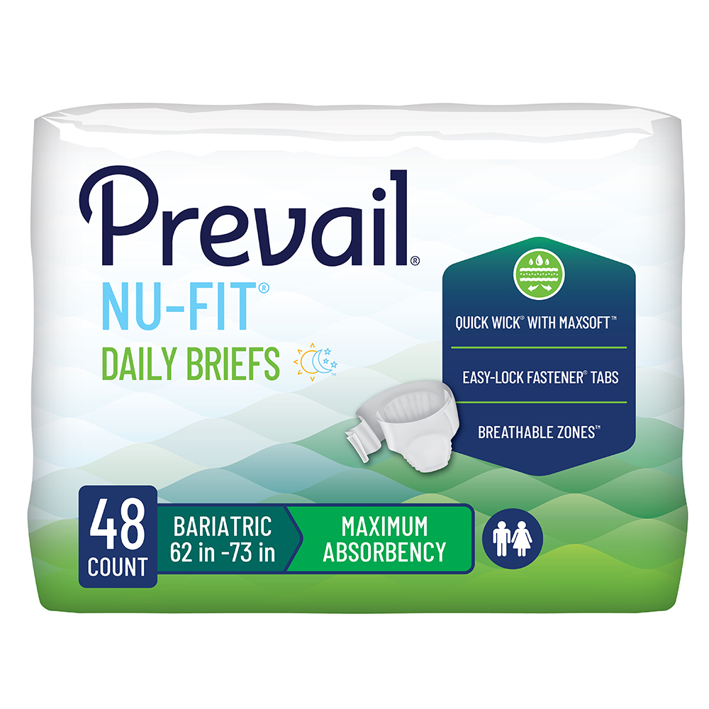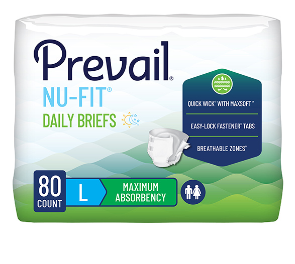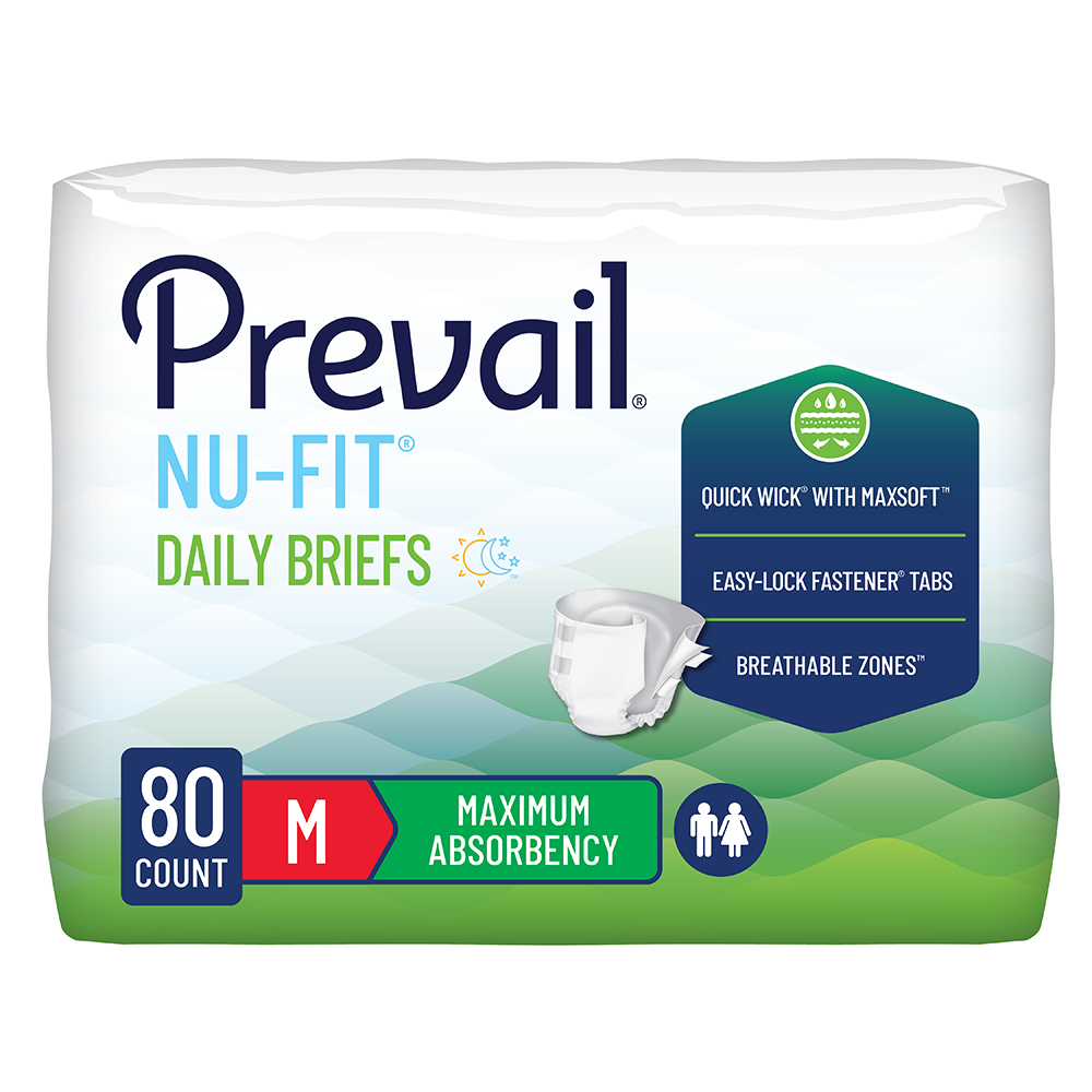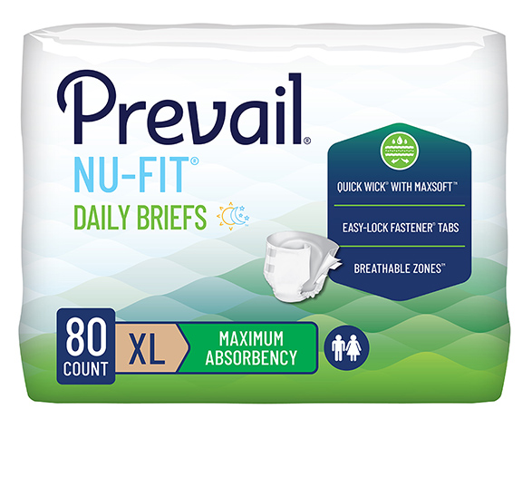Prevail® Nu-Fit® Adult Briefs offer incredible comfort and maximum protection at a great everyday value. Features include: 1) Breathable Zones™ allow the skin to breathe, 2) Cloth-Like Outer Fabric that is soft and comfortable, 3) QUICK WICK® with MaxSoft™ and a fast absorbing thin core rapidly lock away moisture and odor, and 4) Easy-Lock Fastener® (ELF®) reattaching tabs that grip and hold without being sticky.